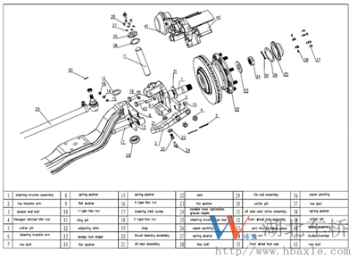 HT30F05前橋總成由工字梁、轉向節總成、氣壓盤式制動器總成、制動盤及輪轂總成、轉向節臂、橫拉桿總成等組成。它具有噪音低、運行平穩、安全系數高、制動性能好等優點.