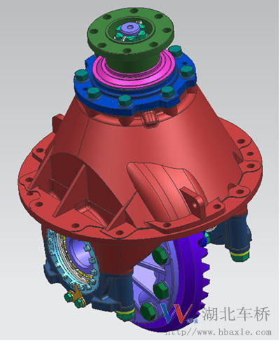新能源客車主減總成為單級減速結(jié)構(gòu),由主減速器殼、左右差速器殼、軸承座、主從動錐齒輪、行星齒輪、半軸齒輪、十字軸、突緣總成、主動錐齒輪油封總成、軸承等零部件組成,扭矩大、傳動效率高