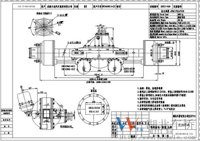 2402D094-010-6.33 主減速器總成噪音低,傳遞扭矩大。主減速器總成計突緣端面至橋殼中心線距離為349mm(見如下安裝尺寸圖)。主、從動錐齒輪是專門針對客車要求噪音低、壽命長等特點,其傳遞扭矩16500N.M,裝配成總成后噪音在86dB以下,壽命可達70萬次以上,深受用戶的好評。