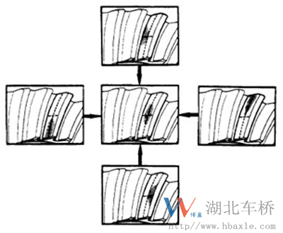 7)調(diào)整:a/c兩項通過增加或減少主動錐齒輪墊片2的方法進行調(diào)整;b/d兩項則通過調(diào)整齒輪的齒側(cè)間隙進行調(diào)整。