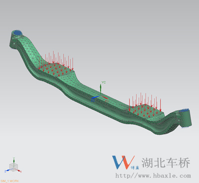 前軸模型采用10節點四面點單元,與轉向節采用固定連接(見圖1中蘭色標記),朝-YC方向沿兩托板垂直各施加力(為額定載荷的2.5倍見圖1中紅色箭頭)。