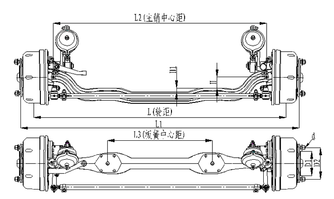 1.前軸為整體鍛造結(jié)構(gòu),采用加強(qiáng)設(shè)計(jì),承載能力強(qiáng); 2.輪距、板簧距可靈活調(diào)整;3.車輪輪輞定位方式可采用球面定位或止口定位